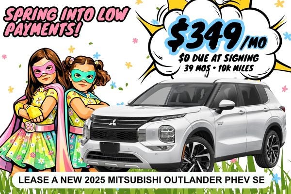 Stock #M25218, 2025 Mitsubishi Outlander PHEV SE, VIN SZ055843, MSRP $48530 Lease for $349.54 per month for 39 months totaling $13632.06. 10,000 miles per year, $0.25 per mile over. $0 due at signing includes $2326.98 cap cost reduction, $595 acquisition fee, and $689 doc fee. Prices include all costs to be paid by a consumer, except for licensing costs, registration fees, and taxes. $0 security deposit. Total Cost of Lease is $13632. Purchase Option is $32515.10 plus applicable fees. Lessee responsible for maintenance, insurance, wear and tear, and $495 disposition fee at lease end. All offers with Tier 1 credit approval through Santander Bank, not all will qualify. Subject to vehicle inspection. Optional dealer-installed protection products are available at additional cost and can be removed at the customer’s request. Dealer not responsible for typographical errors or numerical errors. Valid at Mitsubishi. See dealer for full details. Offer Expires 4/30/2026.