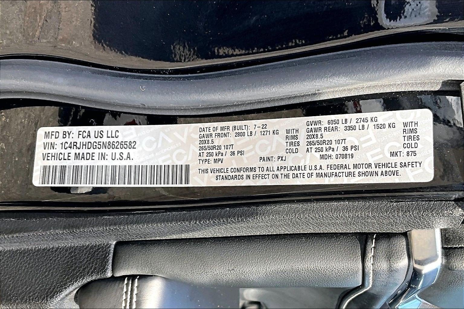 Additional highlights include Quadra Lift air suspension, Selec Terrain drive modes, heated and ventilated front seats, heated second row seats, heated steering wheel, hands free power liftgate, adaptive cruise control with stop and go, blind spot monitoring, Apple CarPlay and Android Auto, Uconnect navigation with a large touchscreen display, premium 19 speaker audio system with 950 watt amplifier, and 20 inch aluminum wheels.