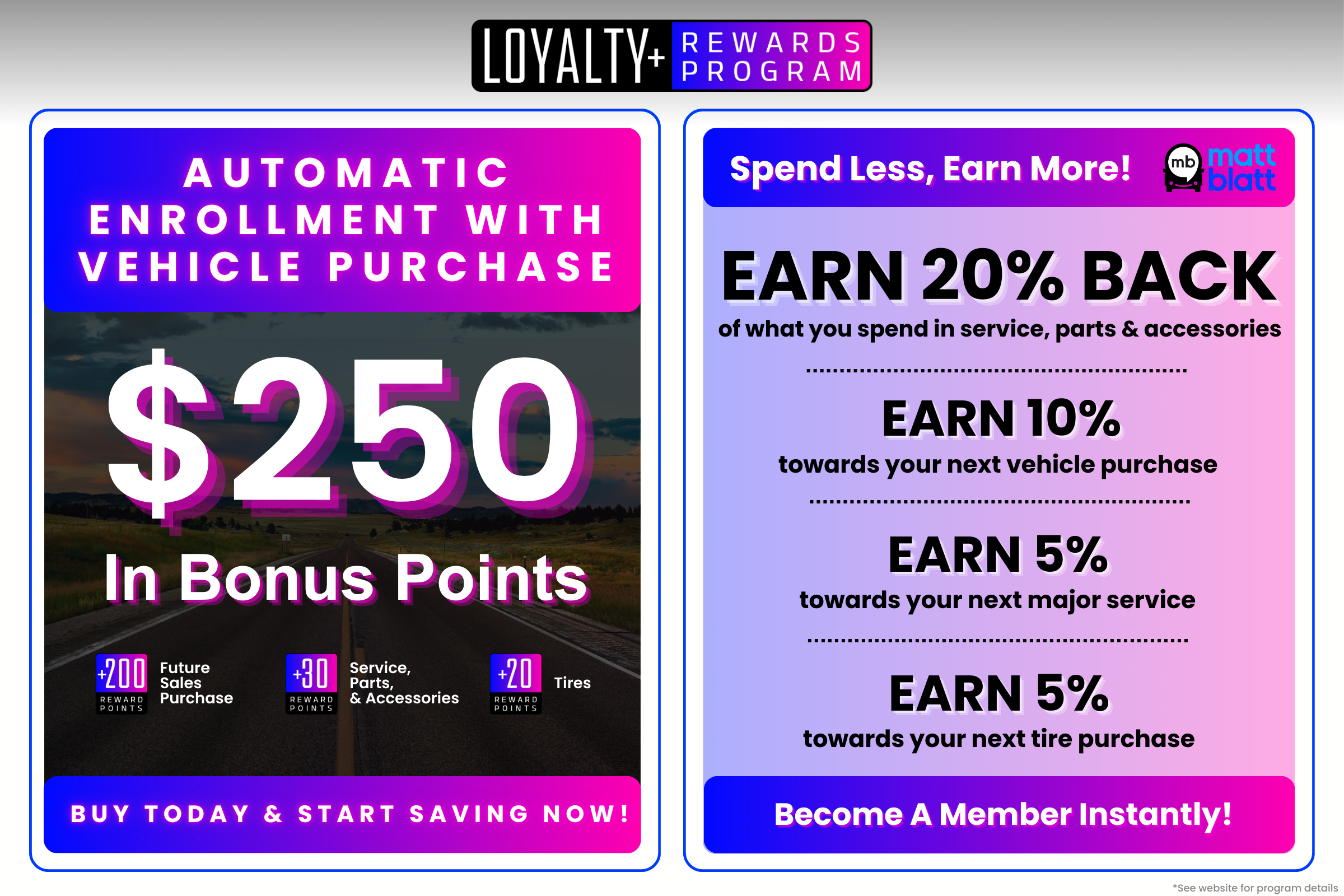 Matt Blatt, Tradepending, and Autofi make every effort to ensure the accuracy of information on this site. However, data or typographical errors may occur, and we reserve the right to correct them once identified. Vehicle pricing and availability are subject to change without notice, and all vehicles are subject to prior sale. Prices include all costs to be paid by a consumer, except licensing, registration, and taxes. IN ORDER TO QUALIFY FOR THE “MATT BLATT PRICE” INTERNET PRICING FOR NEW VEHICLES YOU MUST HAVE A CONFIRMED APPOINTMENT SCHEDULED AND KEPT WITH OUR INTERNET CENTER AND A PRINTED COPY OF THE PUBLISHED PRICE MUST BE PRESENTED IN PERSON TO A SALES REPRESENTATIVE PRIOR TO PURCHASING. INTERNET PRICING CANNOT BE USED IN CONJUNCTION WITH ANY OTHER PRICING OR ADVERTISEMENT. Optional dealer-installed protection products are available at additional cost and can be removed at the customer’s request. EPA-estimated mileage; actual mileage will vary. Offer expires at midnight tonight.